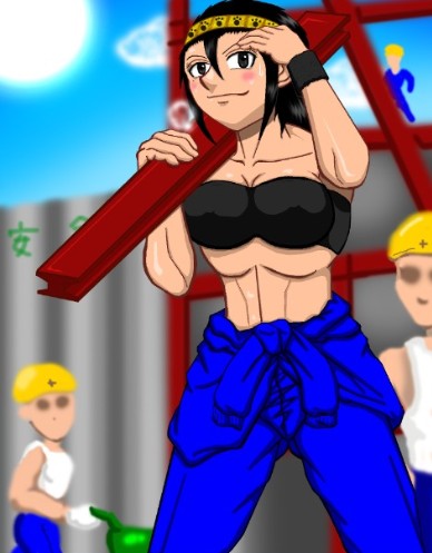 よく晴れた昼下がり。空がとても青く澄み渡っていると言うのに、ビル建設の工事現場から耳障りな騒音が鳴り響く。 その騒音の中で、男達は汗水垂らしながら働いている。 よく見ると、その男達に紛れて若い女性が一緒になって働いている。 顔の容姿は人の好みによるが整った方で、右目下に泣きぼくろがあった。 長い髪の毛もヘアバンドで後ろに留め、仕事の邪魔にならないようにしている。 服装は作業着であるつなぎ服の上部を脱ぎ腰に結び、上半身には黒いスポーツブラとリストバンドといういかにも肉体労働向きの格好をしていた。 一見すると本当に男性肉体労働者にも見えてしまいそうだが、その女性特有の豊かな胸のふくらみが彼女が女性だと言う事を知らしめている。 だが彼女の腕は共に働く男性と比べれば細いが、それでも筋肉を纏っている。 彼女は重たいセメントの袋を一人で2袋も肩に乗せ運んでいた。 「いやぁ董子ちゃんは凄い力持ちだよねぇ」 作業員の一人が彼女に声をかける。 「ありがとさん」 彼女が手短に礼をする。 それを見て他の作業員も声をかける。 「いやいや、董子ちゃんは女の子なんだから。力仕事は俺達男に任せてくれよってことさ!」 「ハハッ!逆に私しか女が居ないからさ、皆に負けねぇように張り切ってるってことさ!」 彼女は笑いながら答えた。そう言ってさらにもう一袋肩に乗せ始めるのだった。 他の作業員達もその様子をみて集まってきた。 「でも董子ちゃんは俺達のアイドルなんだからねぇ、もう少し女の子っぽくしてほしいなぁ」 「おいおい、もしかして私に色目使ってるのかぁ〜?わたしゃまだ女子高生だぞ〜?変な眼で見てたら承知しないぞ〜?」 作業員達は照れ隠しするように笑っていた。彼女もつられて微笑む。 「董子ちゃんは19歳じゃないか〜女子高生って言うのもどうかと思うぞ〜」 「良いじゃないのさ、定時制高校通ってるんだからさ、ジューブン女子高生だって!」 「女子高生なら女子高生らしくしたら?最近のJKみたいにエンコーでもしたら?」 「ちょっと!女子高生らしくないからって女の子に面と向かって言う事じゃないでしょ!」 そういってアカンベーをしてそそくさと仕事に戻った。 その様子を仕事仲間の作業員達は笑いながら見ていた。 「…良い子ですよね。」 「あぁ、うちのカカァの若い頃見てぇだ。」 「一人暮らしでここで働きつつ勉学に精を出す…本当に働き者だなぁ」 「きっと良い嫁さんになるだろうね。」 「だけど借金があるんだってな…可哀想に…親が夜逃げしてから彼女が背負ってるってな…」 「…」 皆の間に少し沈黙が続く。それから各自自分の仕事に戻るのであった。 彼女の仕事が終わったのは6時過ぎだった。 「お疲れさーん」 「董子ちゃん学校頑張ってね」 「はーい」 彼女は作業着のまま荷物を担いで工事現場の事務所を出た。 関係者以外立ち入り禁止の柵を越え、すぐわきの道路を見ると、高そうな車が一台止まっていた。 その車の横には、サングラスをし背広を着た男がタバコをふかしながら立っていた。 男は彼女に気がつくと、サングラスを外し声をかける。 「お疲れ様、董子ちゃん。」 「橋本さん、今日もすみません。」 「いやいや、送り迎えなんて全然苦じゃないからね。さ、乗った乗った。遅刻しちゃうぞ」 そう言って男は車のドアを開け、彼女は颯爽と車に乗り込んだ。 その横に男が乗り込む。二人が乗ったのを確認し、運転手は車を動かす。 彼女は横に乗っている彼を見た。 見られているのに気が付き彼は彼女に視線を返す。 「どうかしたの?」 彼女は少し微笑んだ。 「いや…橋本さんは本当にヤーさんなのかなぁ〜って思ってね」 良く見ると彼の背広には組バッチが付けてある。さらにネクタイには高そうな留め具が。 顔を注意深く見ると眉間近くに化粧で隠した切創もある。 それらの事から外見的に彼がヤクザであることがうかがえる。 「まぁねぇ、普通のヤーさんは自分の所からお金を借りている人を送り迎えしたりしないからね。」 「私はあんたの所から一銭も借りてませんよー」 彼女は頬を膨らませてむすっとした。 「はいはい、でも仕方ないでしょ、俺達が潰した組の借用書に君の家族の名前が書いてあったんだから。 それに借金も半分に減らしてあげたんだし、ね。そんなむすっとしないの。」 彼女はそれを聞いて少し微笑んだが、すぐ下を向いた。 「感謝してますよ…あんなに有った借金を半分チャラにしてもらって…なおかつ授業料も出してくれるなんて…」 それを聞いて彼はタバコを深く吸う。 「普通のヤーさんはそこまでしないな、普通は。でも俺は普通じゃないからな…任侠ってのを一番に置きたいと思っている…。 だから君の境遇に…同情って言っちゃ悪いが、助けてあげたくなっちゃうんだよなぁ〜」 彼女は下を向いたまま笑い始めた。 「ははは!だからいくらヤクザっぽい恰好しててもカタギだと思われてチンピラに喧嘩売られるんでしょ!」 「うるさ