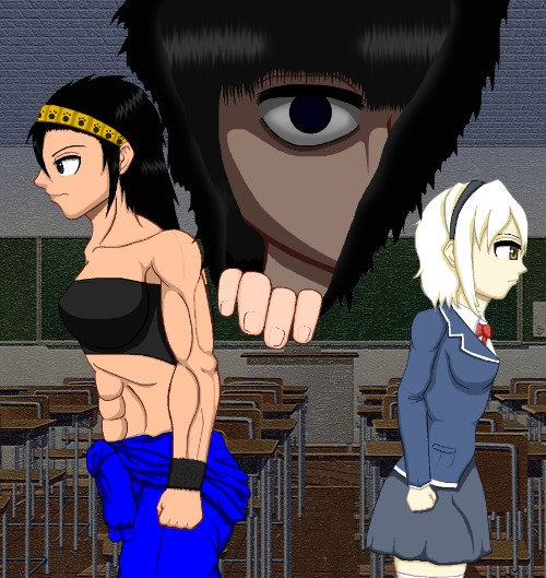 時計の針が10時半を回ったところで授業が終わった。 授業が終わったところで健太郎が董子の所にやってきて一緒に帰ろうと誘う。 ここまではいつも通りであったが、ここでいつもとは違う事が起こった。 「………獅子土…………董…子…さんでしたっけ………」 なんと転入生である南陽子が董子に話しかけてきた。 「あ、あぁ、そうだけど…どうしたんだい?」 董子は少し緊張気味だった。理由は言わずもがな、自分の身が何か南陽子にあると訴えていたからだ。 そんな董子の緊張を知ってか、南陽子は深く頭を下げた。 「すみません…………私………すごい目つき……悪くて……さっき…見てた時も…なんか嫌な気持ち…させちゃったみたいで… 本当に………申し……訳ないです…………」 その言葉を聞いて董子は胸をなでおろす。 こんなに丁寧な人に何わけのわからない恐怖心を抱いていたのかと、一瞬自分がおかしく思えたのだ。 「なんだ、さっき私が睨んだ事かい、気にすんな!転入生だから、少し警戒しちゃっただけさ、咲耶みたいだったらどうしようって」 そう言って咲耶を指差す。 「んなアホな!なんでウチを指差すん!?」 「この前なんか危ないような漫画描いてなかったっけ」 「あれは入稿日が近づいてたから仕方なかったんや!堪忍な!」 その様子に皆笑っていたが南陽子は一瞬も笑わない。 「…獅子土さん………すこし………お話したい事が……………あるんですが………お時間は……?」 それを聞いて董子は外を見る。外の道路には橋本が車を止めている。 橋本を少しまたしていても問題ないだろうと董子は考え、南陽子の要求に承諾した。 「そうですか………しかし…………皆さんの前で……話すことでは…ないので…他の教室で……」 そう言って董子を廊下に誘う。南陽子に誘われ董子は廊下にでる。 董子が出たその時、どんな時も笑っていなかった南陽子が少し微笑んでいる事に梓は気がついた。 梓が南陽子に声をかけようとしたが、もう二人とも廊下に出てしまった後であった。 さっき彼女は笑っていた…!?本当にまさか…いや、私の思い違いかしら… 梓の胸に不安が募る。その時、クラスの一人が言った。 「あれ?南陽子さんって、なんで獅子土さんの名前知ってたんだ?」 梓は目を見開いてその言葉の方を見た。 「え?先生に当てられたんじゃないの?それか自分で自己紹介したんじゃない?」 その言葉を聞いた瞬間梓は教室を飛び出した。 董子ちゃんは先生に当てられてもいないし自分から名乗ってもいなかった!と言う事は…! 梓は暗い廊下を全速力で走る、董子たちの向かった方に。 董子と南陽子は理科室に来ていた。 暗い理科室は不気味な雰囲気が漂っている。肝試しにはもってこいと言う感じだ。 「こんなところに連れてきて…話っていったい何?」 董子がそう問いかけた瞬間、暗い理科室の暗闇の、南陽子の居る辺りの暗闇が、更に暗さを増したように見えた。 その暗闇の変化に気がついた瞬間、董子の背中から汗が噴き出した。 何かが向かってくる!そう董子は身の危険を感じ、今いる位置から後ろに一歩跳んで離れた。 が、次の瞬間、彼女のスポーツブラが何かによって引きちぎられたように破れた。 「なっ!」 董子は思わず声を上げる。が、胸を隠す余裕はなかった。 何故なら南陽子の周りの暗闇は「暗闇」であって暗闇でない「何か」であり、董子はそれに恐怖していたためだ。 足がガクガクと震え、顔にも汗が滴り、彼女のその豊かな胸にも汗が滝のように流れていた。 「ゲハハハハァ! 良いのかァそんな乳牛みてェなデッケェ乳房を隠さんでもよォ!オイ!」 南陽子の方から、漂々とした声が響く。 董子は南陽子の周りの暗闇を目を凝らして見つめた。 「おィおィおィ!そこじゃねェぞ!コッチだコッチィ!ヒヒッ!」 南陽子のすぐ横の暗闇に、鋭く黄色い目が二つ浮かび上がった。 そしてその目の下のあたりの暗闇が、ガパァっと不気味に開く。 その開いた空間が、まるで鋭い牙の並んだ口のようであった。 董子はその不気味な物を、わけがわからず見ているだけだった。 暗闇に出来た口のような所が、本当に口のように動き始める。 「ヒャッヒャッヒャ!そんな驚かなくてもよォ!なァ!し・し・ど・と・う・こォ!!」 「……………暗男……………黙って…………」 董子は意を決して問いかけた。 「一体何なんだ!あんた化け物だったのか!?目的が私だと言うつもりか!?」 暗闇に浮かんだ目と口はニタァという表情を作った。 「そぉ言うこたァ!本当はもう少し他の連中も見つけてからにしよォと思ったんだけどなァ! 他の連中を探すよかァ、既に見つけてる奴の口を割らせた方が良いと思ってよォォオオオ!」 董子がそれに反論しようと思った時には既に、暗闇が董子を包み込み、彼女の体をギリギリと締め上げる。 そのまま董子の体が空中に持ち上がり、天井に押しつけられた。 「………暗男は……エッチだから………変な事……される前に……教えなさい………」 それ